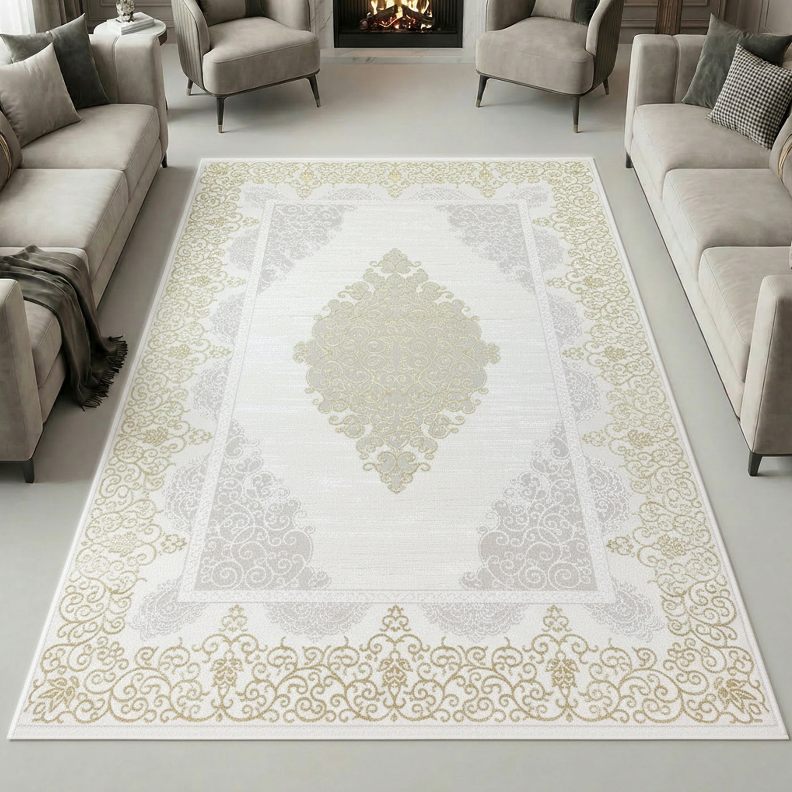 Orientalischer Designerteppich mit Ornament in weiß gold grau