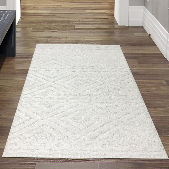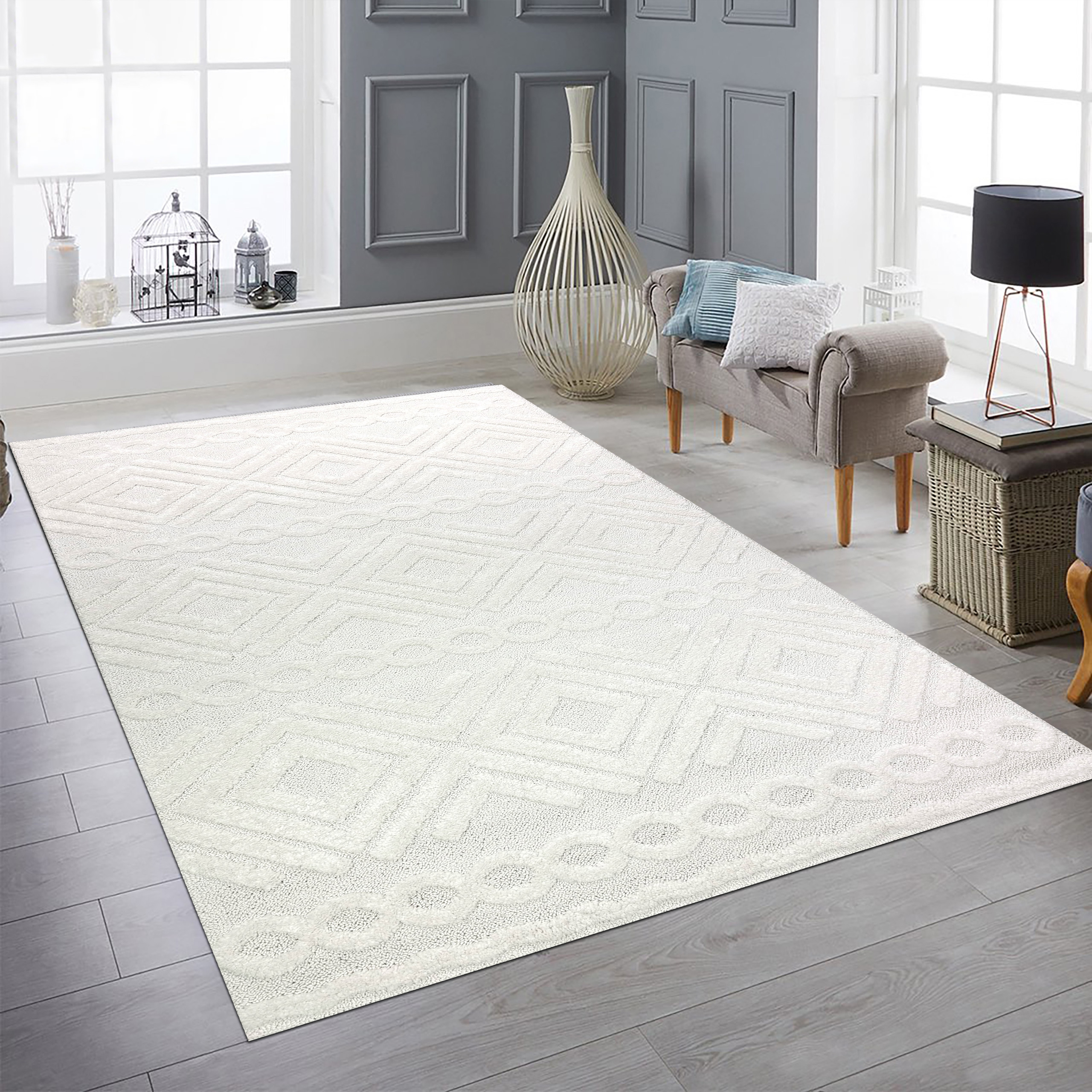 Boho Wohnzimmerteppich mit Rauten und Kreisen in Creme